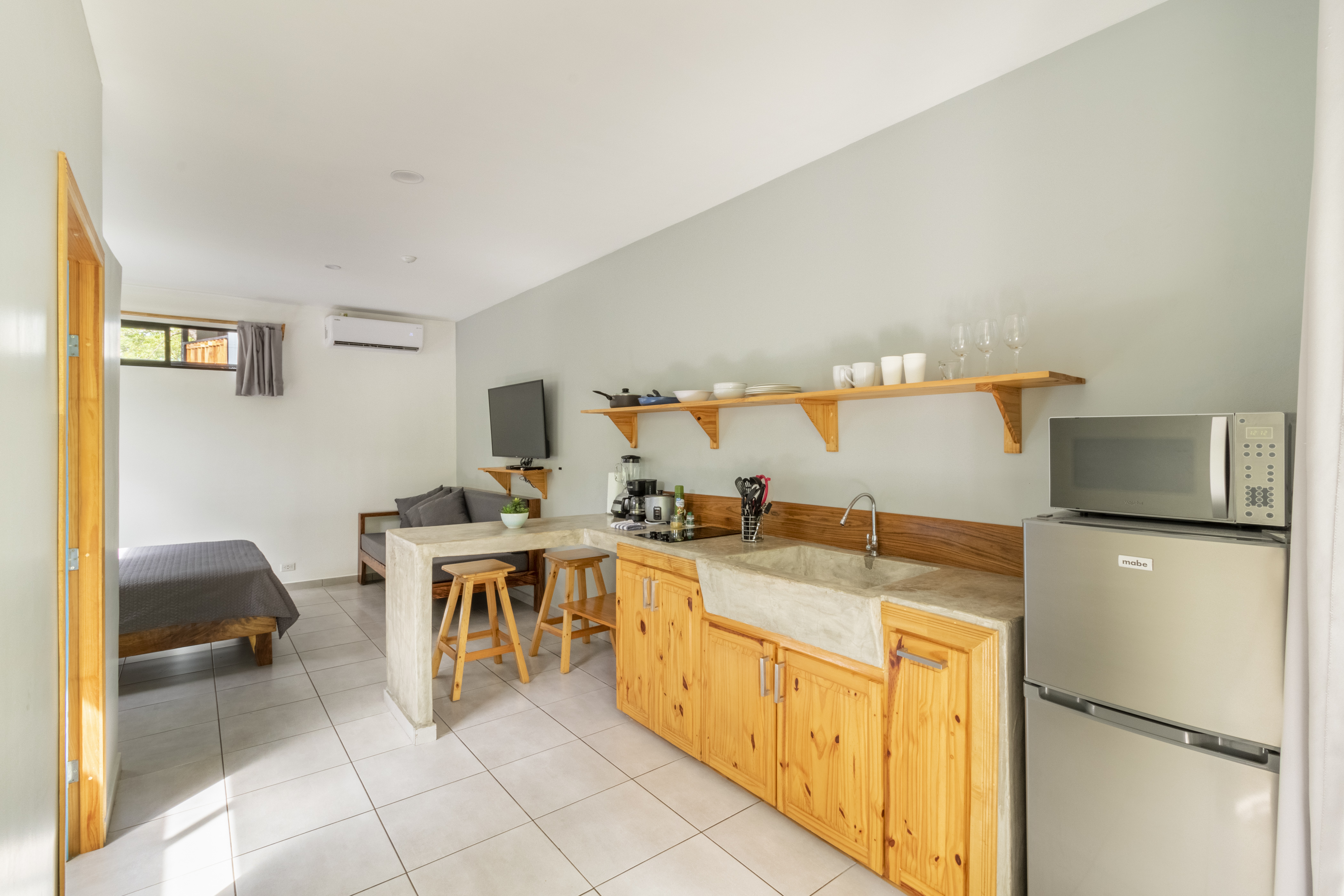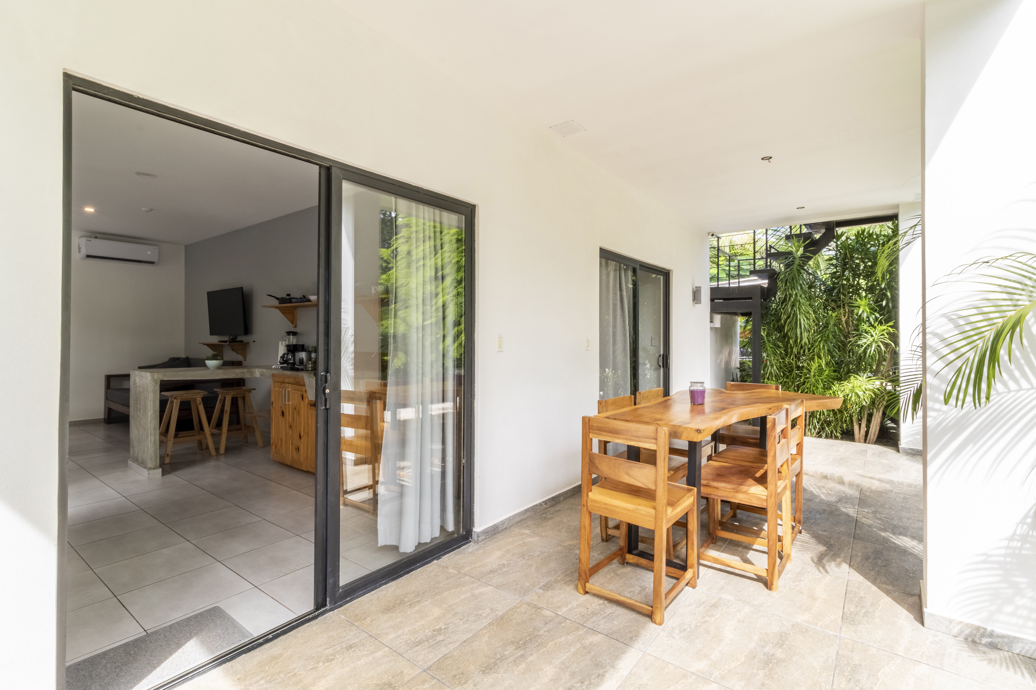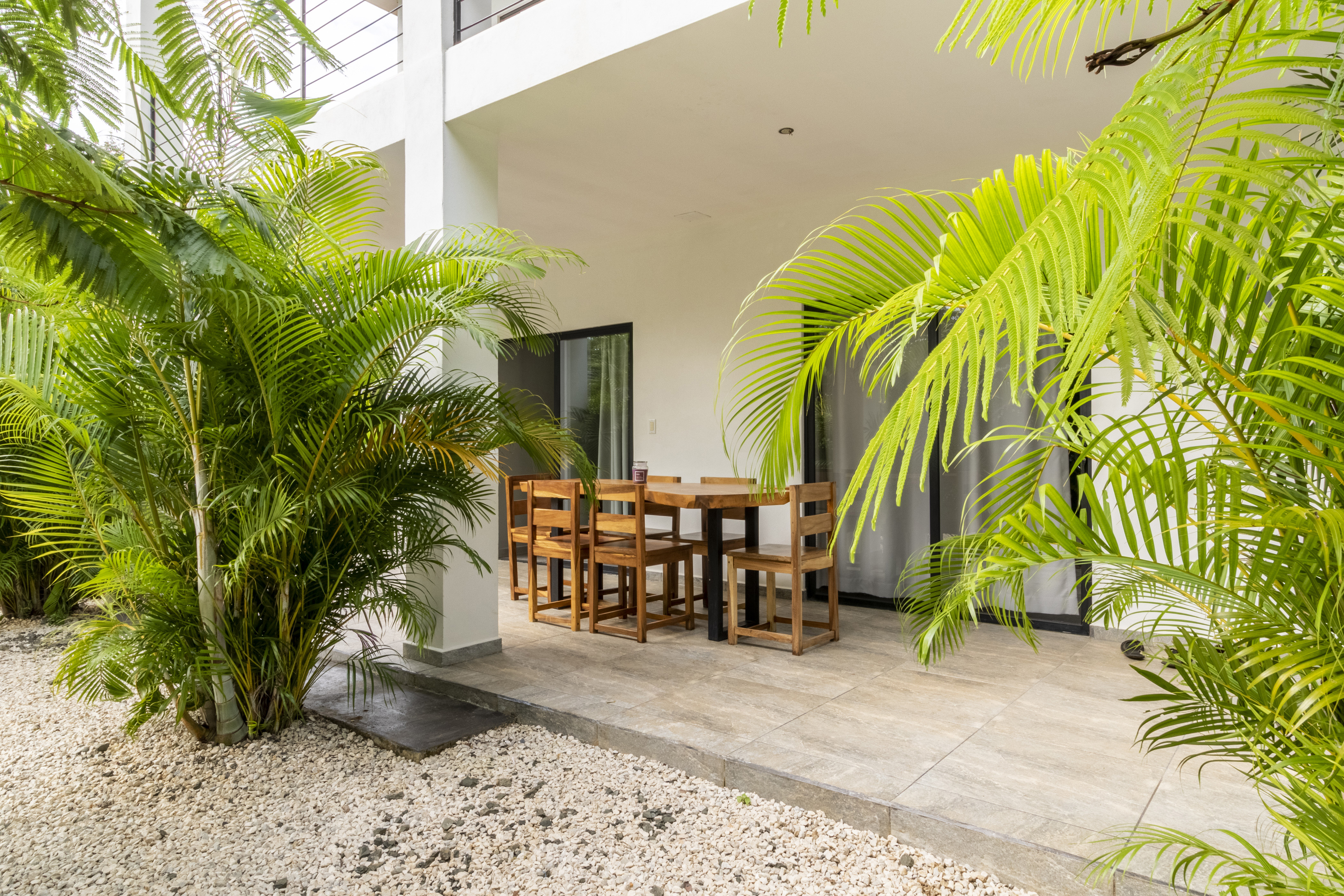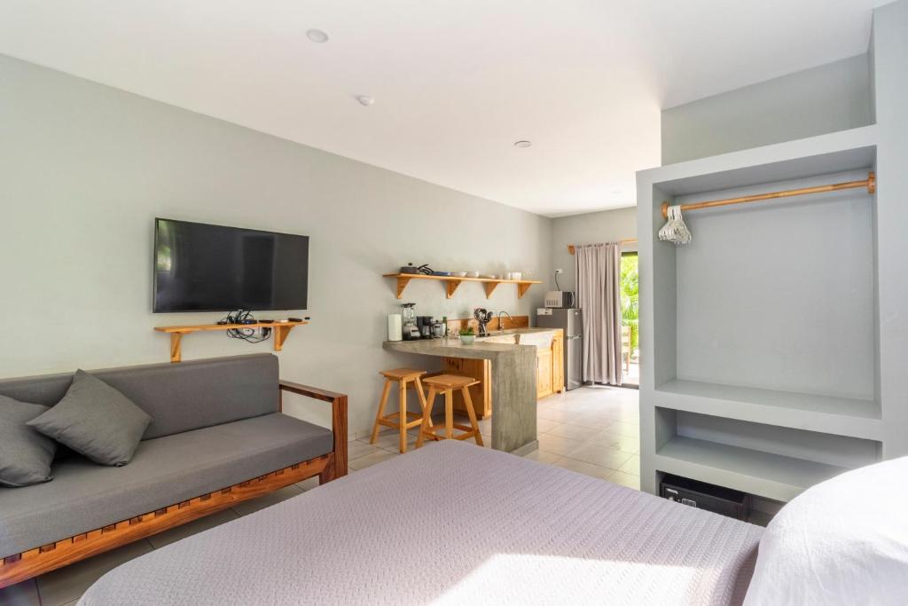 Relájese en nuestros apartamentos tipo estudio, donde la comodidad se fusiona con la serenidad de Guanacaste. Cada habitación es un santuario a solo unos pasos de las arenas vírgenes de Playa Avellanas. Disfrute de internet de fibra óptica de alta velocidad, cocinas pequeñas y hermosas terrazas rodeadas de exuberante vegetación.